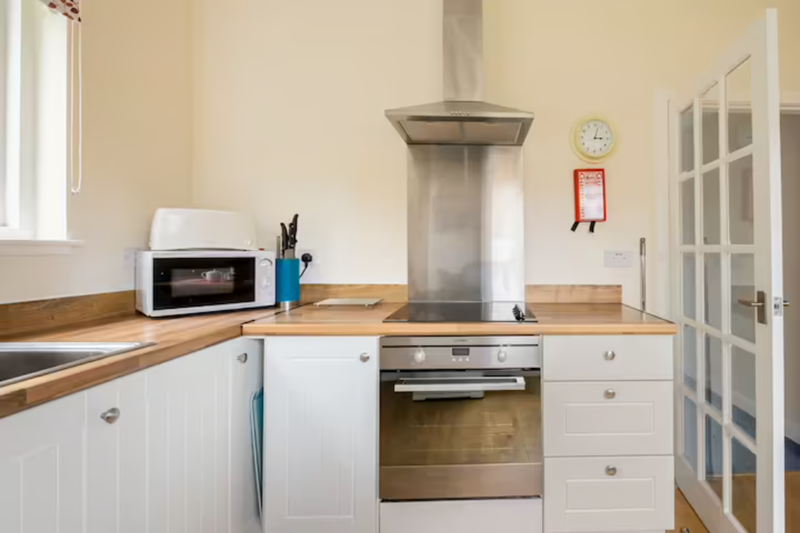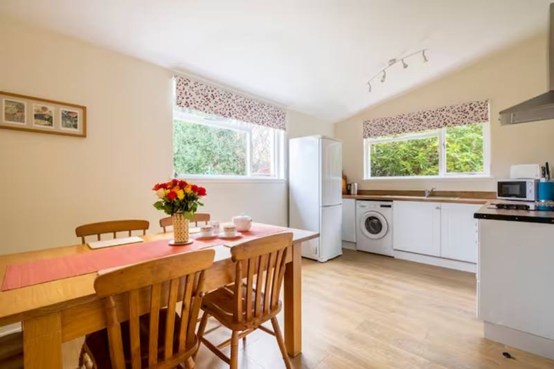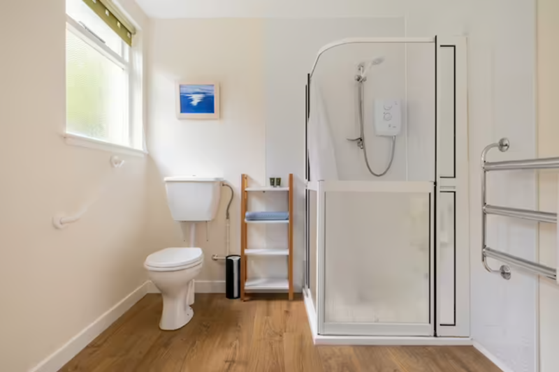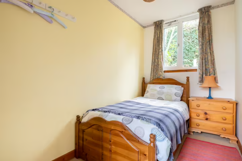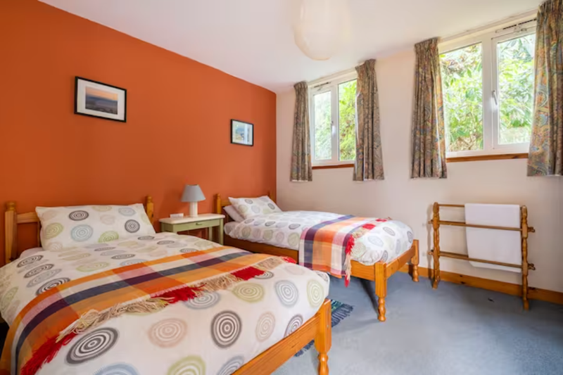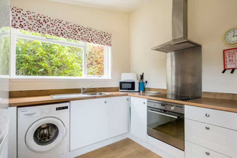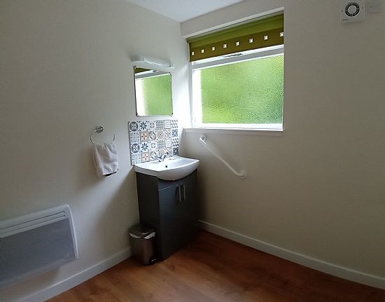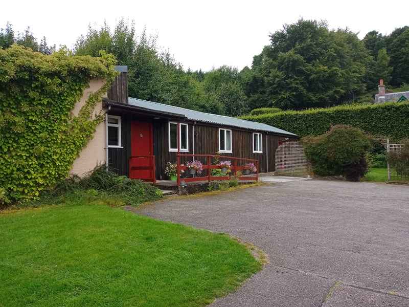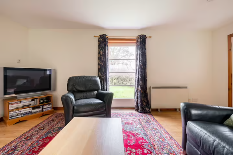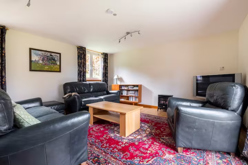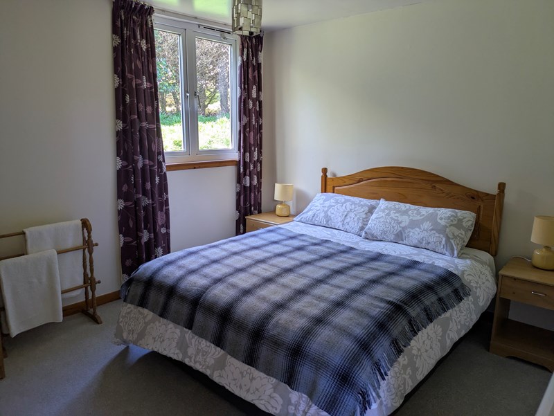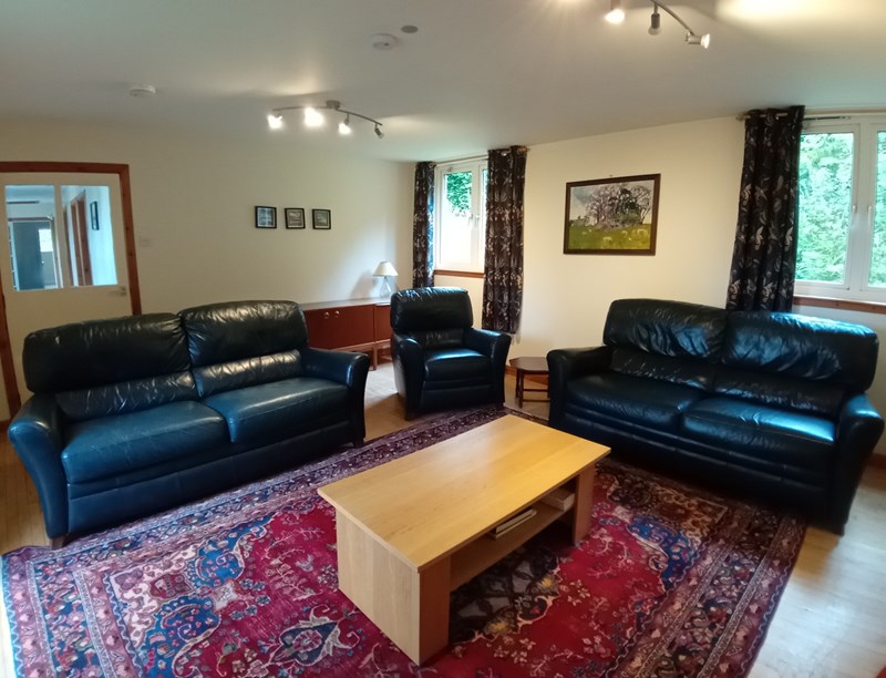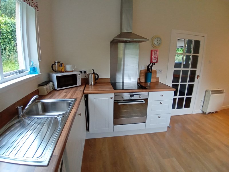 The entrance hallway has plenty of room for coats & boots. On the left is the large kitchen with views of the Peffery Valley. There is an extending dining table for up to 6 seated, a microwave, electric hob cooker and double fan oven, fridge/freezer and plenty of cupboard space. Also from the hallway is the shower room with toilet and washbasin. It is spacious enough to easily accomodate a wheelchair and if required the shower cubicle has a seat suitable for the less able along with handrails by the toilet. Next door is an additional toilet with whb. The hallway to the right leads to the three bright bedrooms -1 double, 1 twin, 1 single and then to the lounge with its solid wood beech flooring and access to the private garden area with picnic bench.